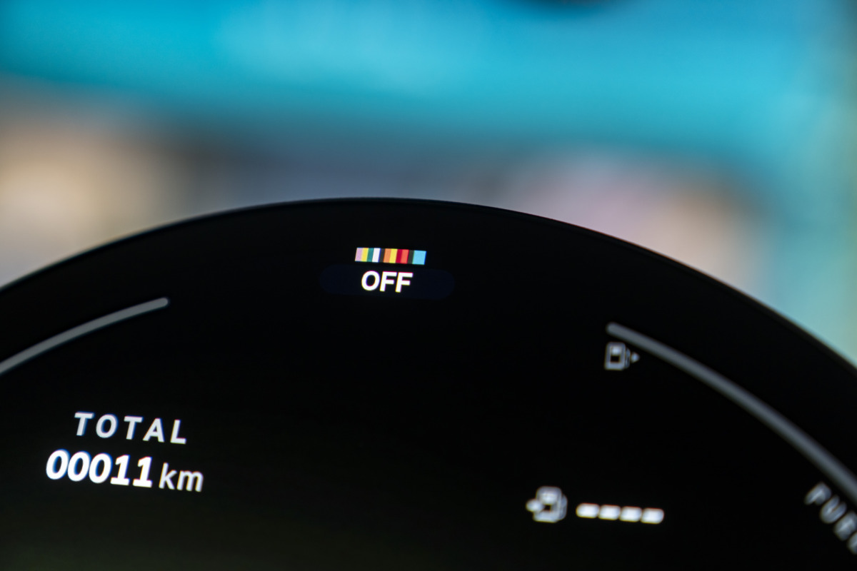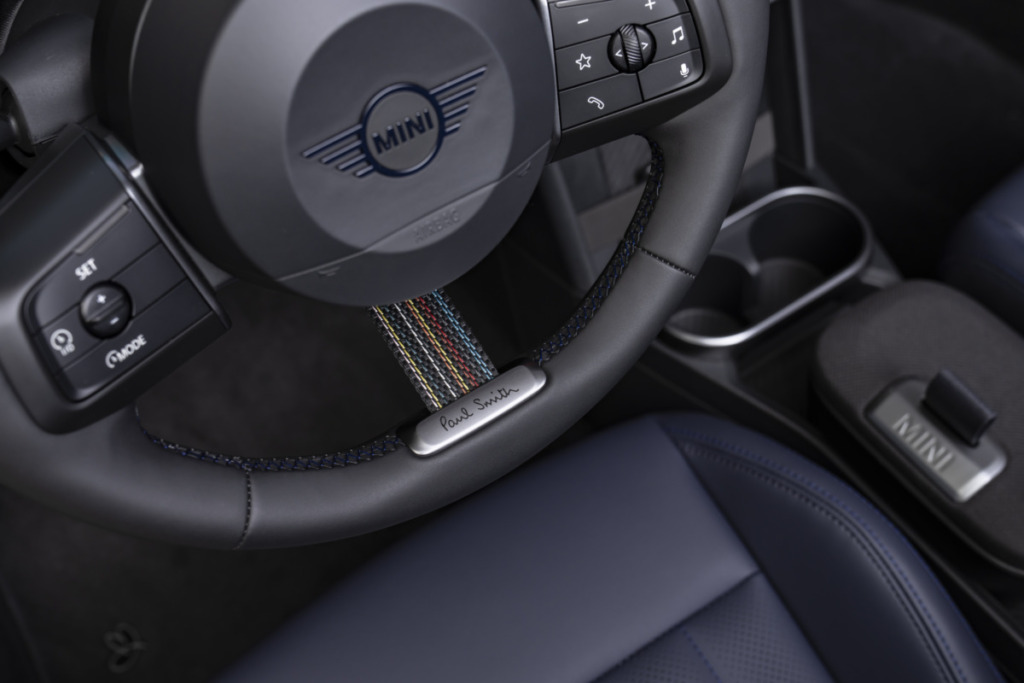 ステアリング・ホイールのテキスタイル・ストラップには、シグニチャー・ストライプをモチーフにしたポールスミスの飾り縫いが施されています。